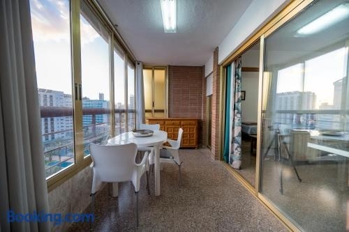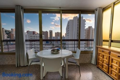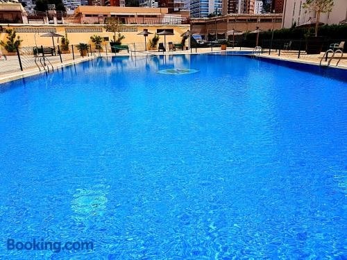 One bedroom Flat with shared pool in Acuarium II se află în Benidorm și are cazare cu WiFi gratuit și vedere la oraș, precum și o piscină în aer liber, o grădină și o terasă.